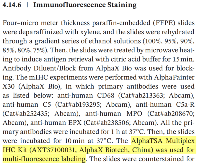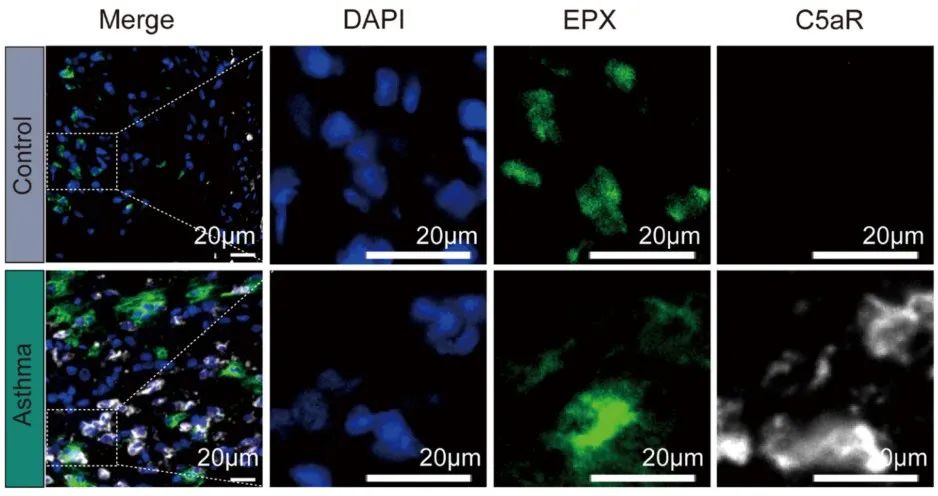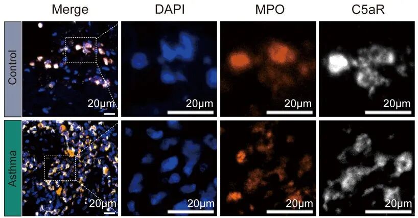 本研究涉及的mIHC實(shí)驗(yàn)中TSA染料來自艾克發(fā)生物的AlphaXTSA®多靶點(diǎn)免疫組化染色試劑盒,支氣管活檢的mIHC Panel1(C5aR、EPX、DAPI)顯示嗜酸性粒細(xì)胞中補(bǔ)體受體C5aR(C5aR1)的表達(dá)顯著高于對(duì)照組;Panel2(C5、CD68、DAPI)顯示與慢性咳嗽對(duì)照者相比,哮喘患者中表達(dá)補(bǔ)體C5的巨噬細(xì)胞百分比顯著更高;Panel3(C5aR、MPO、DAPI)顯示哮喘組表達(dá)C5aR的中性粒細(xì)胞百分比相對(duì)于對(duì)照組無差異。