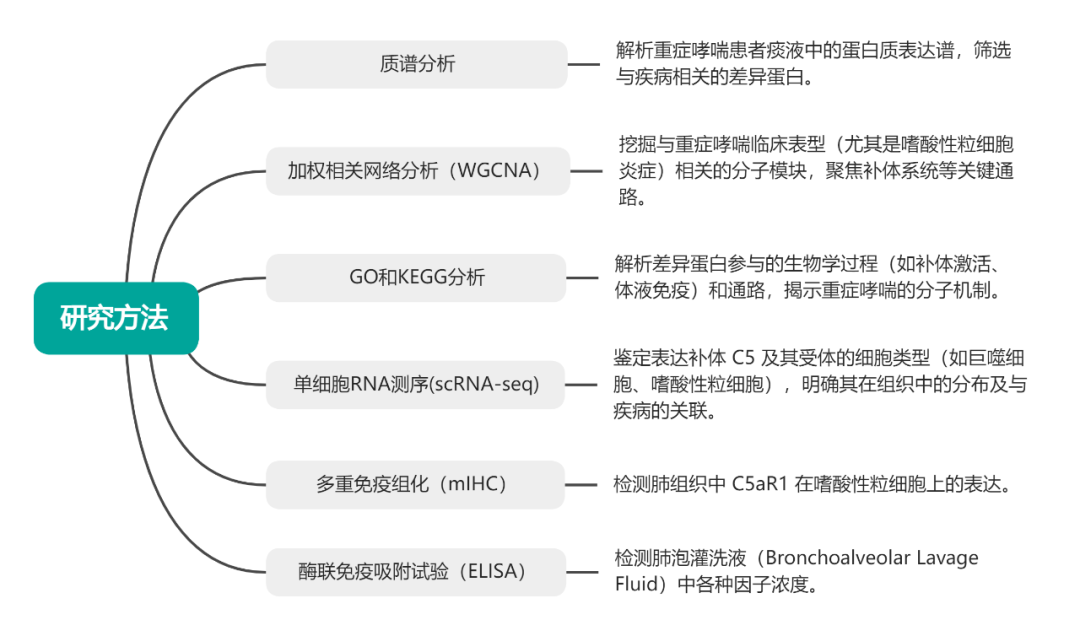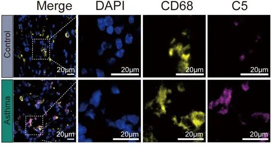 該研究通過對(duì)健康對(duì)照者和重度哮喘患者的痰蛋白表達(dá)譜分析,發(fā)現(xiàn)補(bǔ)體系統(tǒng)激活相關(guān)的WGCNA“棕色”模塊與嗜酸性粒細(xì)胞炎癥呈正相關(guān),其中C5及下游補(bǔ)體蛋白在痰嗜酸性粒細(xì)胞水平高(≥3%)的患者中上調(diào)。單細(xì)胞RNA測序和免疫熒光染色確定巨噬細(xì)胞是C5的主要來源。體內(nèi)實(shí)驗(yàn)也證實(shí),在過敏性小鼠模型中抑制C5可減輕炎癥,而在IL-5轉(zhuǎn)基因小鼠中用重組C5直接刺激會(huì)增加嗜酸性粒細(xì)胞炎癥。這些結(jié)果強(qiáng)調(diào)了補(bǔ)體系統(tǒng)C5在重度哮喘患者中的重要性,為未來的治療策略提供了潛在的目標(biāo)。