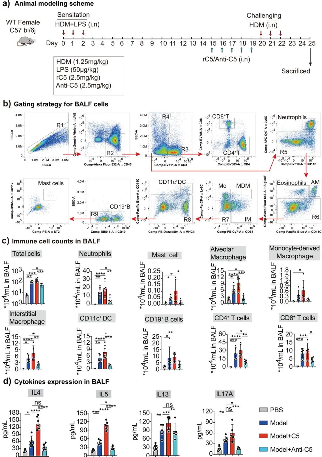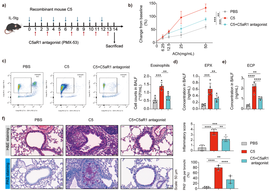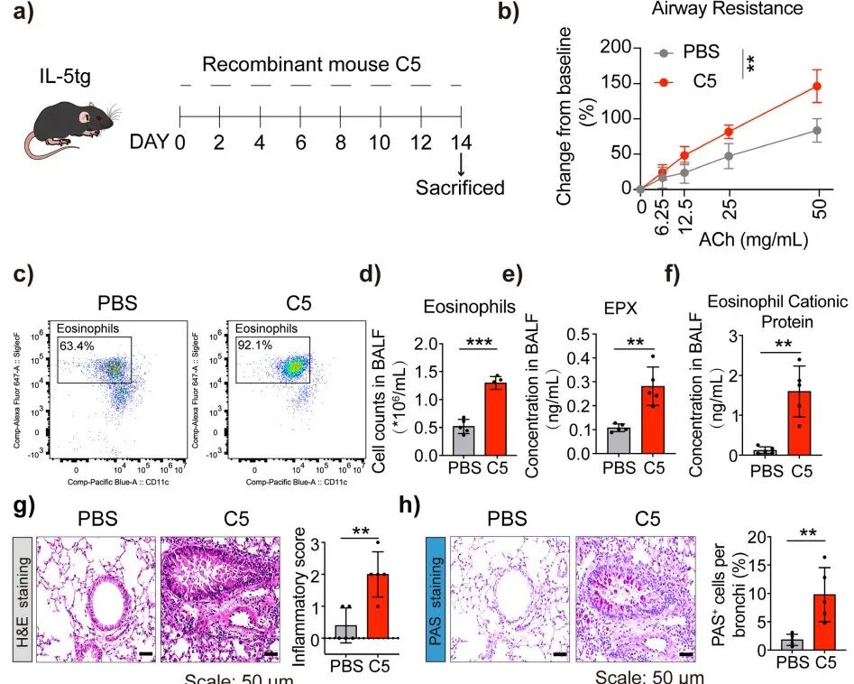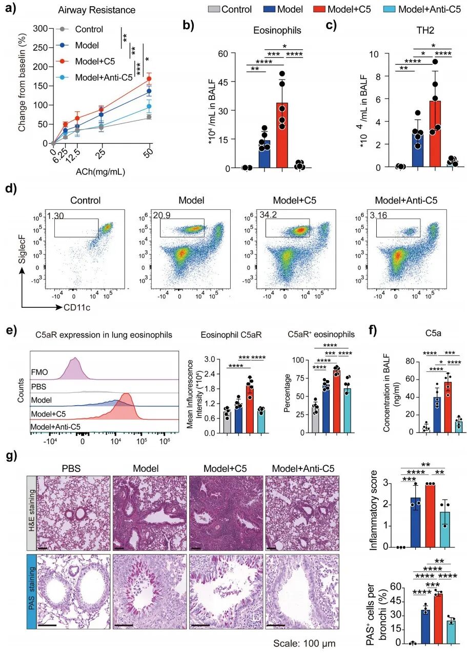 研究人員采用屋塵螨(HDM)聯(lián)合低劑量脂多糖(LPS)刺激的激素抵抗性哮喘小鼠模型(每組5只)來模擬重度哮喘(圖S6a)。經(jīng)研究發(fā)現(xiàn)通過鼻內(nèi)給予重組C5會(huì)增強(qiáng)小鼠對(duì)乙酰膽堿的氣道反應(yīng)性,增加支氣管肺泡灌洗液中嗜酸性粒細(xì)胞、Th2細(xì)胞等多種免疫細(xì)胞的數(shù)量,提高相關(guān)細(xì)胞因子水平,而抗C5抗體可逆轉(zhuǎn)這些變化,減輕炎癥浸潤和杯狀細(xì)胞化生。這表明內(nèi)源性C5在哮喘模型的嗜酸性粒細(xì)胞炎癥中起作用,中和C5可緩解相關(guān)病理反應(yīng)。