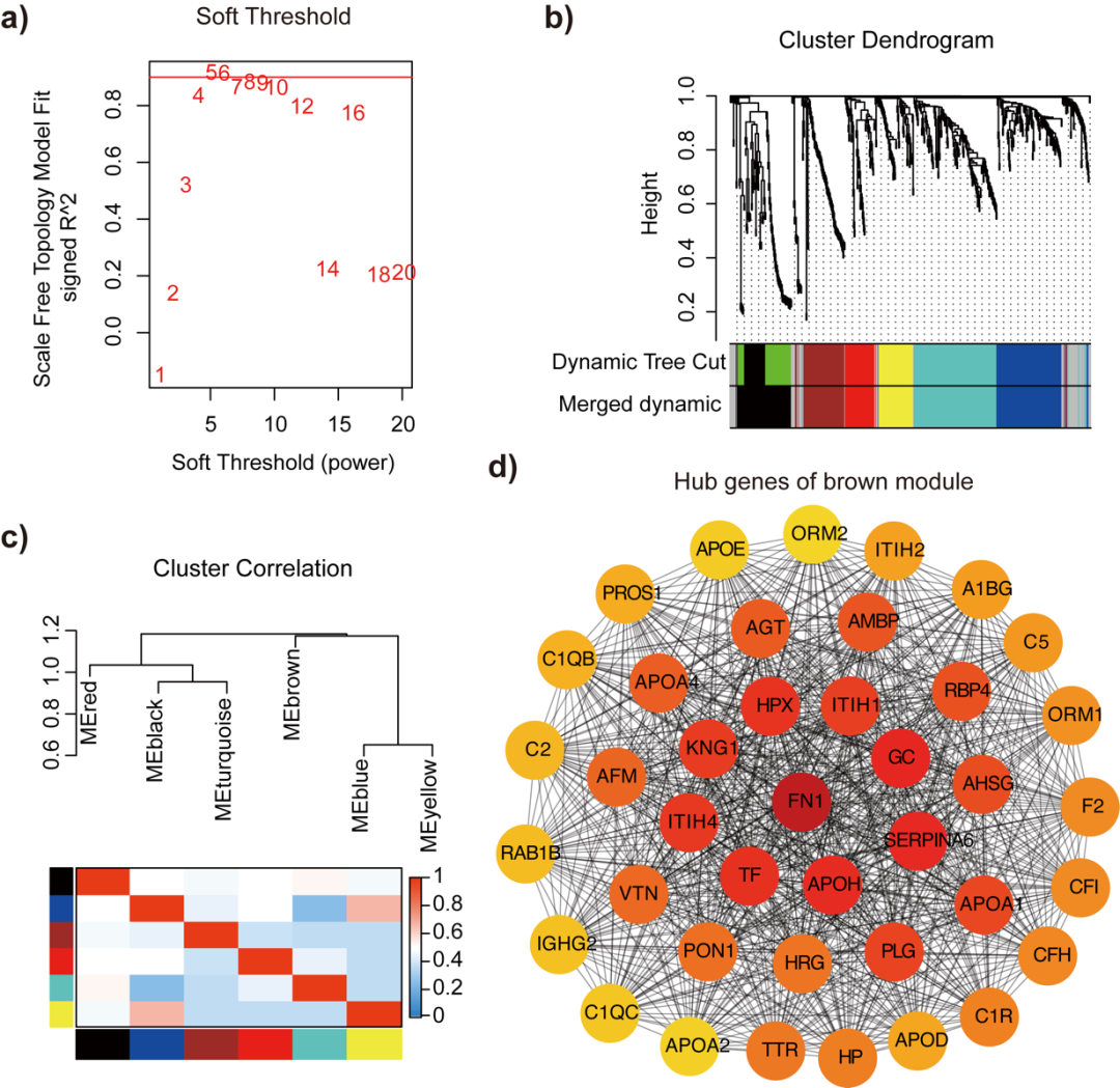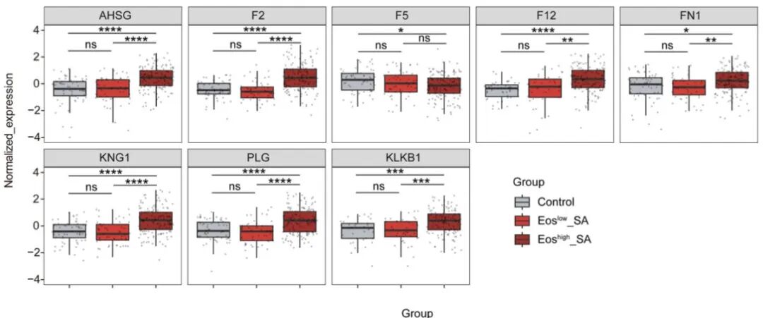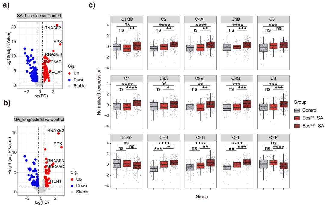研究人員通過加權(quán)相關(guān)網(wǎng)絡(luò)分析對(duì) 436 份痰樣本的蛋白質(zhì)組學(xué)圖譜進(jìn)行研究,得到 7 個(gè)模塊并分析了它們之間的相關(guān)性。其中棕色模塊與病情加重及嗜酸性粒細(xì)胞炎癥標(biāo)志物顯著相關(guān),其包含的蛋白質(zhì)主要參與補(bǔ)體激活、凝血級(jí)聯(lián)反應(yīng)等通路,且相互作用網(wǎng)絡(luò)分析進(jìn)一步確定了補(bǔ)體相關(guān)蛋白(C2、C5、C1QB、C1QC、C1R、CFI、CFH)是棕色模塊的核心蛋白(圖 S1d),這為揭示補(bǔ)體系統(tǒng)與嗜酸性粒細(xì)胞炎癥在重度哮喘中的關(guān)聯(lián)提供了重要依據(jù)。