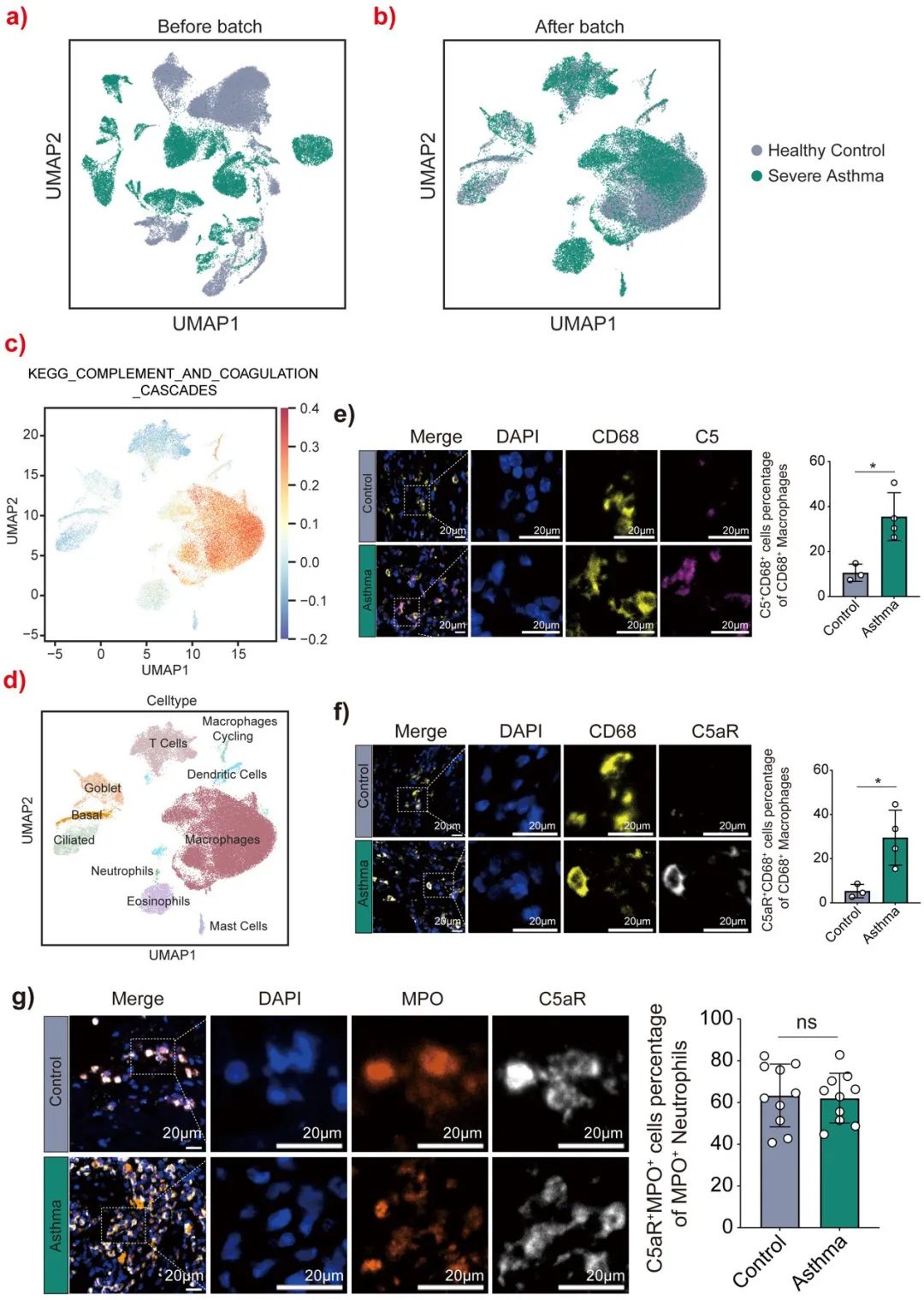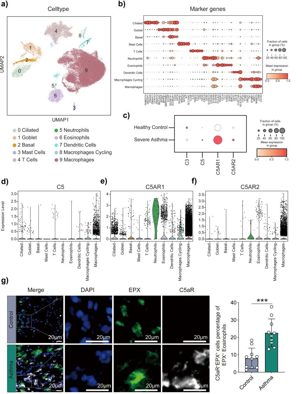 對(duì)4名痰嗜酸性粒細(xì)胞百分比超過3%的重度嗜酸性粒細(xì)胞性哮喘患者(5個(gè)樣本:3個(gè)僅含支氣管肺泡灌洗液(BALF),1個(gè)含支氣管肺泡灌洗液和支氣管黏膜活檢樣本)以及來自已發(fā)表數(shù)據(jù)庫的4名健康對(duì)照者的支氣管肺泡灌洗液數(shù)據(jù)進(jìn)行了單細(xì)胞RNA測序。經(jīng)過數(shù)據(jù)過濾和批次校正(圖S5a、b)后,識(shí)別出10種主要細(xì)胞類型,包括巨噬細(xì)胞、循環(huán)巨噬細(xì)胞、樹突狀細(xì)胞、粒細(xì)胞(包括嗜酸性粒細(xì)胞、中性粒細(xì)胞)和肥大細(xì)胞、T淋巴細(xì)胞、結(jié)構(gòu)細(xì)胞(包括基底細(xì)胞、杯狀細(xì)胞和纖毛細(xì)胞)(圖4a、b)。 與健康對(duì)照者相比,重度哮喘患者的C5、C5aR1和C5aR2表達(dá)增加(圖4c)。補(bǔ)體C5主要在巨噬細(xì)胞亞群中表達(dá)(圖4d),而其受體C5aR1在多種細(xì)胞類型中表達(dá)更廣泛,包括嗜酸性粒細(xì)胞和中性粒細(xì)胞(圖4e),但嗜酸性粒細(xì)胞中C5受體C5aR2的表達(dá)最高(圖4f)?;蚣u(píng)分分析顯示,補(bǔ)體和凝血級(jí)聯(lián)通路在巨噬細(xì)胞中高度富集(圖S5c、d)。支氣管活檢的免疫熒光染色顯示,與慢性咳嗽對(duì)照者相比,哮喘患者中表達(dá)補(bǔ)體C5的巨噬細(xì)胞百分比顯著更高(圖S5e)。哮喘組巨噬細(xì)胞(圖S5f)和嗜酸性粒細(xì)胞(圖4g)中補(bǔ)體受體C5aR(C5aR1)的表達(dá)顯著高于對(duì)照組,而表達(dá)C5aR的中性粒細(xì)胞百分比無差異(圖S5g)。