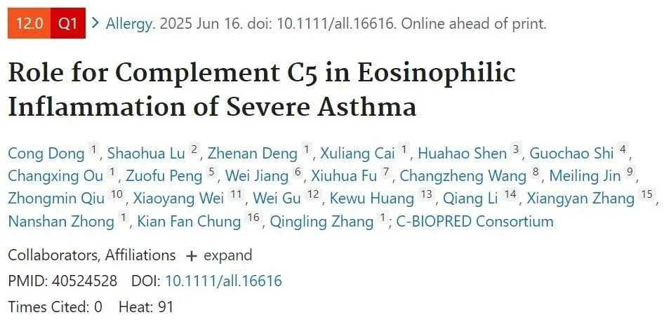 [1]Dong C, Lu S, Deng Z, Cai X, Shen H, Shi G, Ou C, Peng Z, Jiang W, Fu X, Wang C, Jin M, Qiu Z, Wei X, Gu W, Huang K, Li Q, Zhang X, Zhong N, Chung KF, Zhang Q; C‐BIOPRED Consortium. Role for Complement C5 in Eosinophilic Inflammation of Severe Asthma. Allergy. 2025 Jun 16. doi: 10.1111/all.16616. Epub ahead of print. PMID: 40524528.