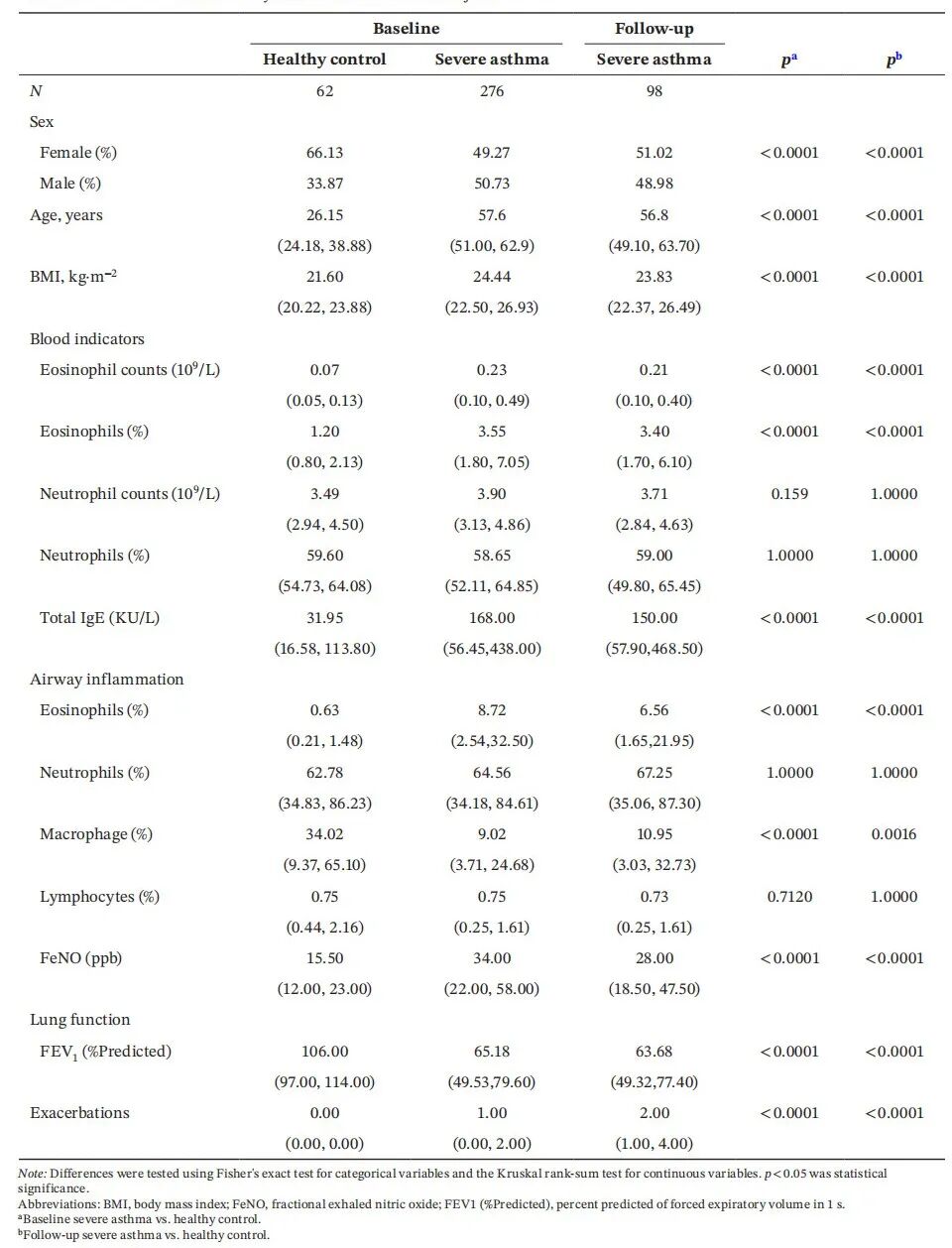 表1 健康對(duì)照組和重度哮喘患者的特點(diǎn)