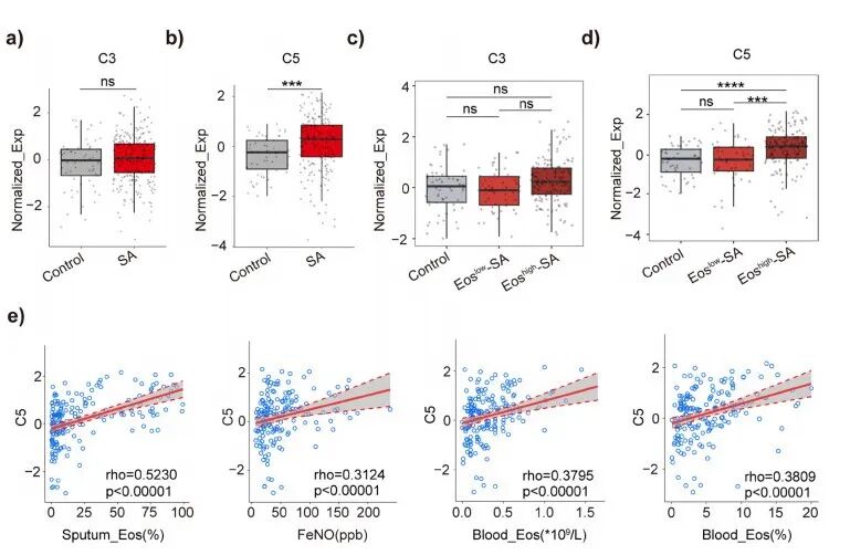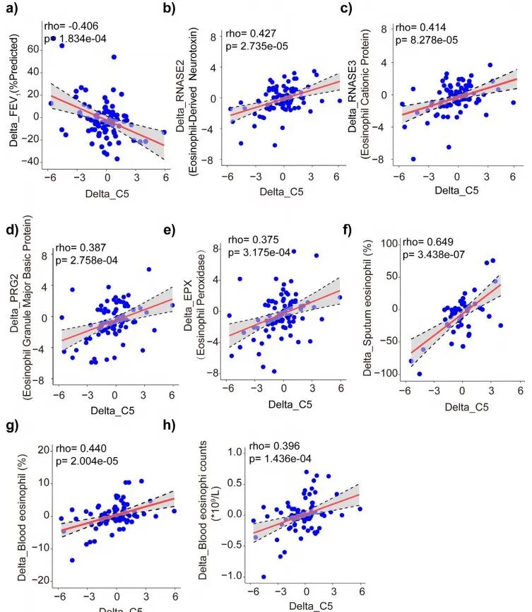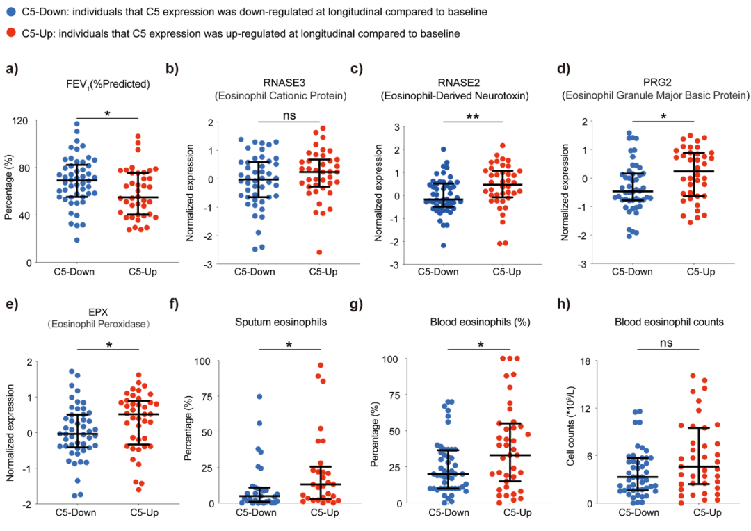 為探究補(bǔ)體C5對(duì)重度哮喘嗜酸性粒細(xì)胞炎癥的影響,研究人員根據(jù)基線和一年縱向隨訪時(shí)相關(guān)指標(biāo)的變化進(jìn)行了相關(guān)性分析,第一秒用力呼氣容積占預(yù)計(jì)值百分比(FEV?% predicted)的變化與C5的變化呈負(fù)相關(guān)(圖3a)。 嗜酸性粒細(xì)胞衍生神經(jīng)毒素(RNASE2)的變化、嗜酸性粒細(xì)胞陽離子蛋白(RNASE3)的變化、嗜酸性粒細(xì)胞顆粒主要堿性蛋白(PRG2)的變化以及嗜酸性粒細(xì)胞過氧化物酶(EPX)的變化均與C5的變化呈正相關(guān)(圖3b-e),此外痰嗜酸性粒細(xì)胞百分比的變化、血液嗜酸性粒細(xì)胞百分比的變化以及血液嗜酸性粒細(xì)胞計(jì)數(shù)的變化也與C5的變化呈明顯正相關(guān)(圖3f-h)。根據(jù)基線和一年后補(bǔ)體C5表達(dá)的差異,將患者分為C5升高組(上調(diào)組)和C5降低組(下調(diào)組)。下調(diào)組的FEV?% predicted高于上調(diào)組(圖S4a)。下調(diào)組的RNASE2、PRG2和EPX的表達(dá)顯著低于上調(diào)組(圖S4b-e)。此外,下調(diào)組的痰嗜酸性粒細(xì)胞百分比和血液嗜酸性粒細(xì)胞百分比也低于上調(diào)組(圖S4f-h)。